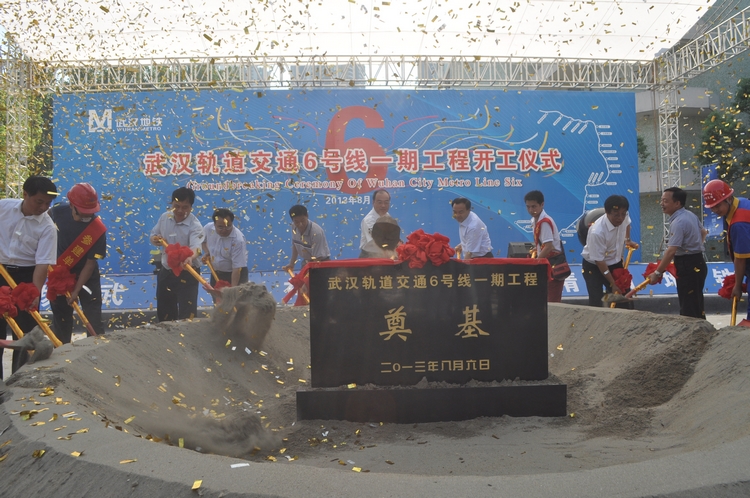 2013年8月6日,銜接漢口、漢陽的重要客運(yùn)交通走廊、武漢市在建最長的軌道交通線路——軌道交通6號線一期工程隆重舉行開工儀式。圖為市委書記阮成發(fā),市長唐良智,與市民代表、設(shè)計(jì)、施工、監(jiān)理單位代表一起,為工程開工培土。