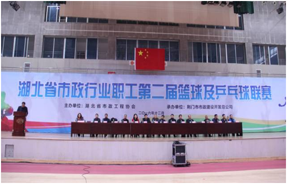 12月12日上午9點(diǎn),由湖北省市政工程協(xié)會(huì)主辦、荊門市市政建設(shè)開發(fā)總公司承辦的全省市政行業(yè)職工第二屆籃球聯(lián)賽在荊門市體育文化中心開幕。省協(xié)會(huì)秘書長(zhǎng)趙亞玲主持開幕式。比賽組委會(huì)有關(guān)人員、運(yùn)動(dòng)員、裁判員及觀眾共200余人參加開幕式。漢陽市政副總經(jīng)理、鐘鑫市政總經(jīng)理方紫微親自帶隊(duì)參加了本次活動(dòng)。