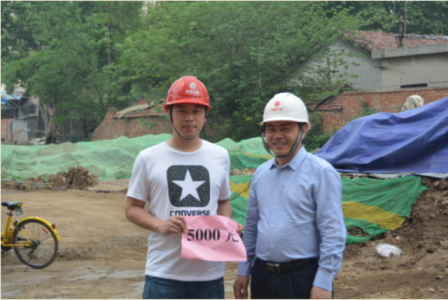 (圖為項目部經(jīng)理彭軼同志接受集團公司“五一”勞動節(jié)慰問金)
