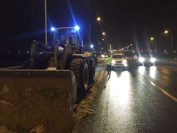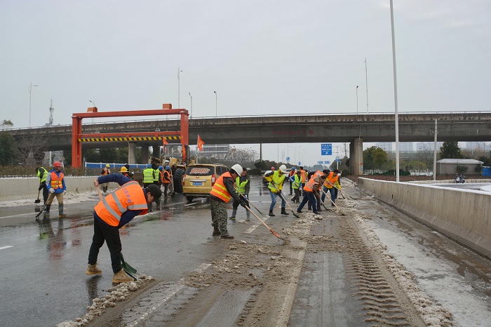 時間來到27日晚上23時,在三環(huán)線白沙洲大橋——國博大道路段,漢陽市政鐘鑫公司的搶險隊伍在漢陽市政集團(tuán)副總經(jīng)理、鐘鑫公司董事長方紫微的帶領(lǐng)和指揮下,克服白天一整天抗雪搶險的疲憊感,緊急調(diào)度機械設(shè)備和搶險人員,連夜前往搶險路段奮戰(zhàn)3小時,在寒冷冬夜順利完成了搶險任務(wù)。