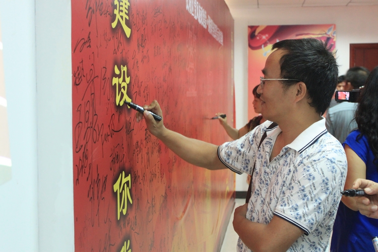 2013年8月21日,公司支部書記王繁帶隊(duì)前往漢陽(yáng)區(qū)文體局反腐倡廉警示教育基地參加漢陽(yáng)市政黨員反腐倡廉警示教育活動(dòng)。圖為支部書記王繁在留言板上簽名留念。